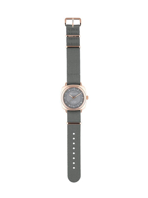 Sold with the interchangeable grey stitched NATO nylon strap: water resistant & washable