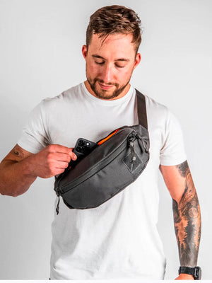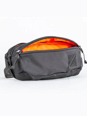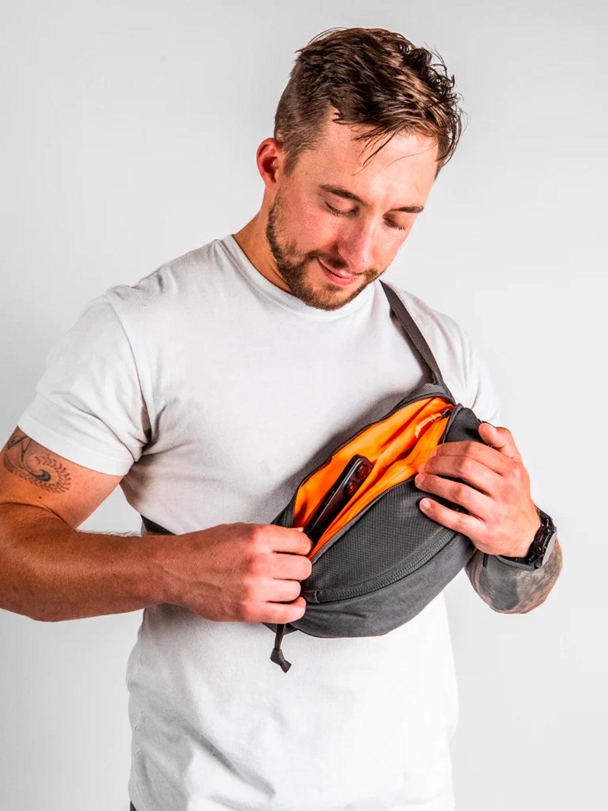 The CIVIC Access Sling in a limited-edition Slate Gray & hi-vis orange interior color.