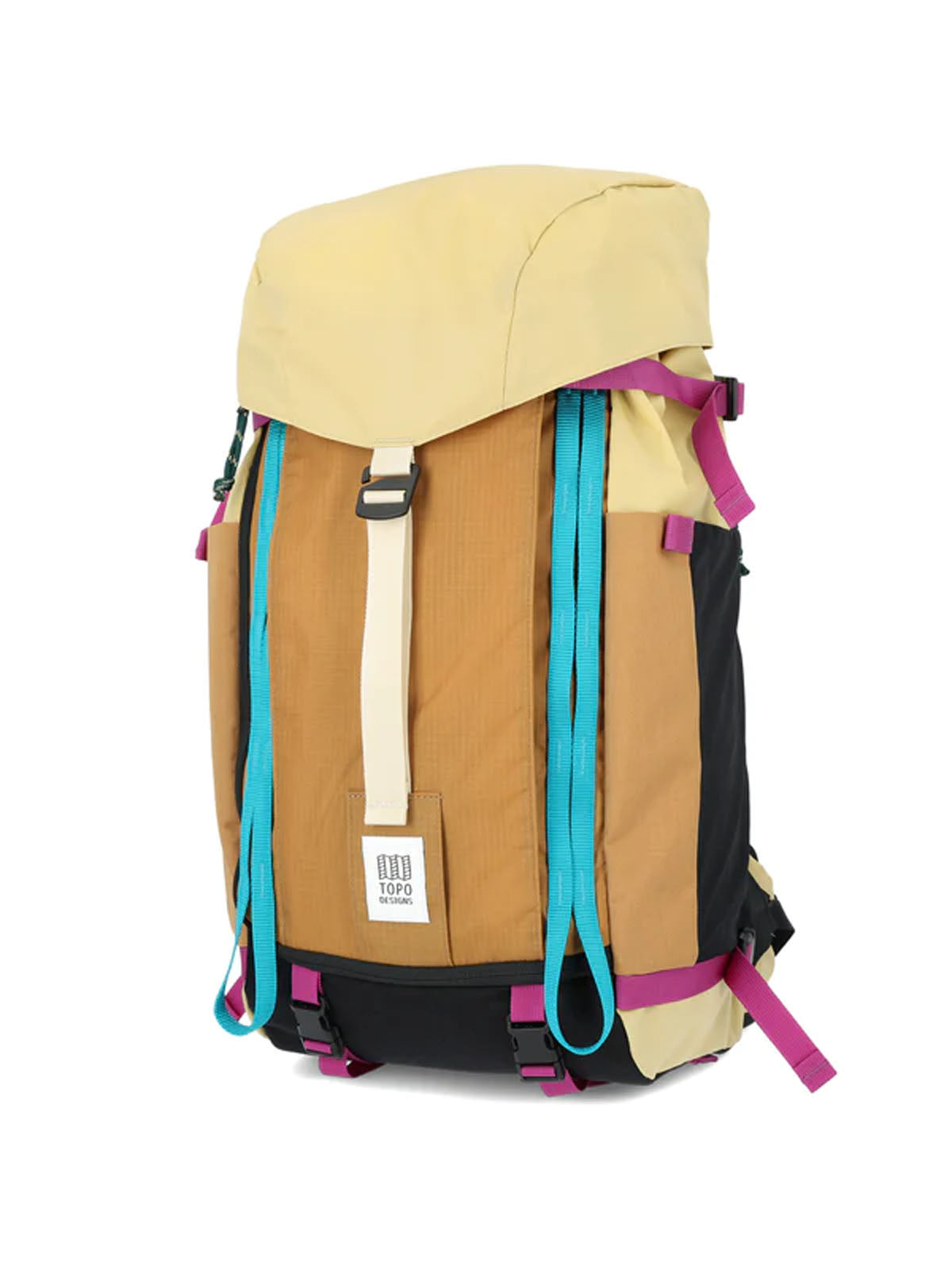 Spacer mesh back panel and shoulder straps make the Mountain Pack a more comfortable carry on the way up to climb, hauling around town or navigating the trail. Organization pockets make it easy to get through TSA, while large side pockets fit full sized water bottles. Four compression straps adjust to the load size, while durable daisy chain webbing is perfect for securing extra gear or attaching a bike light.